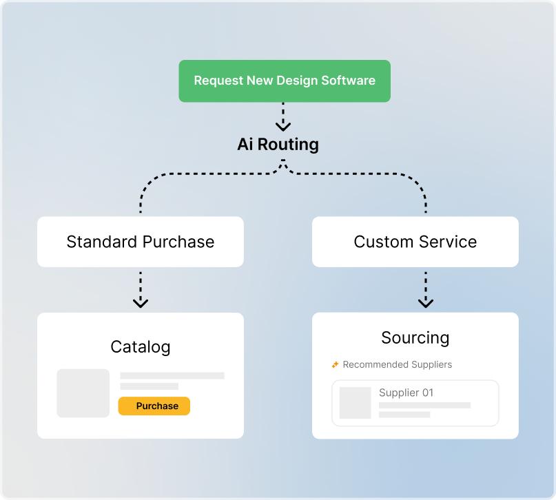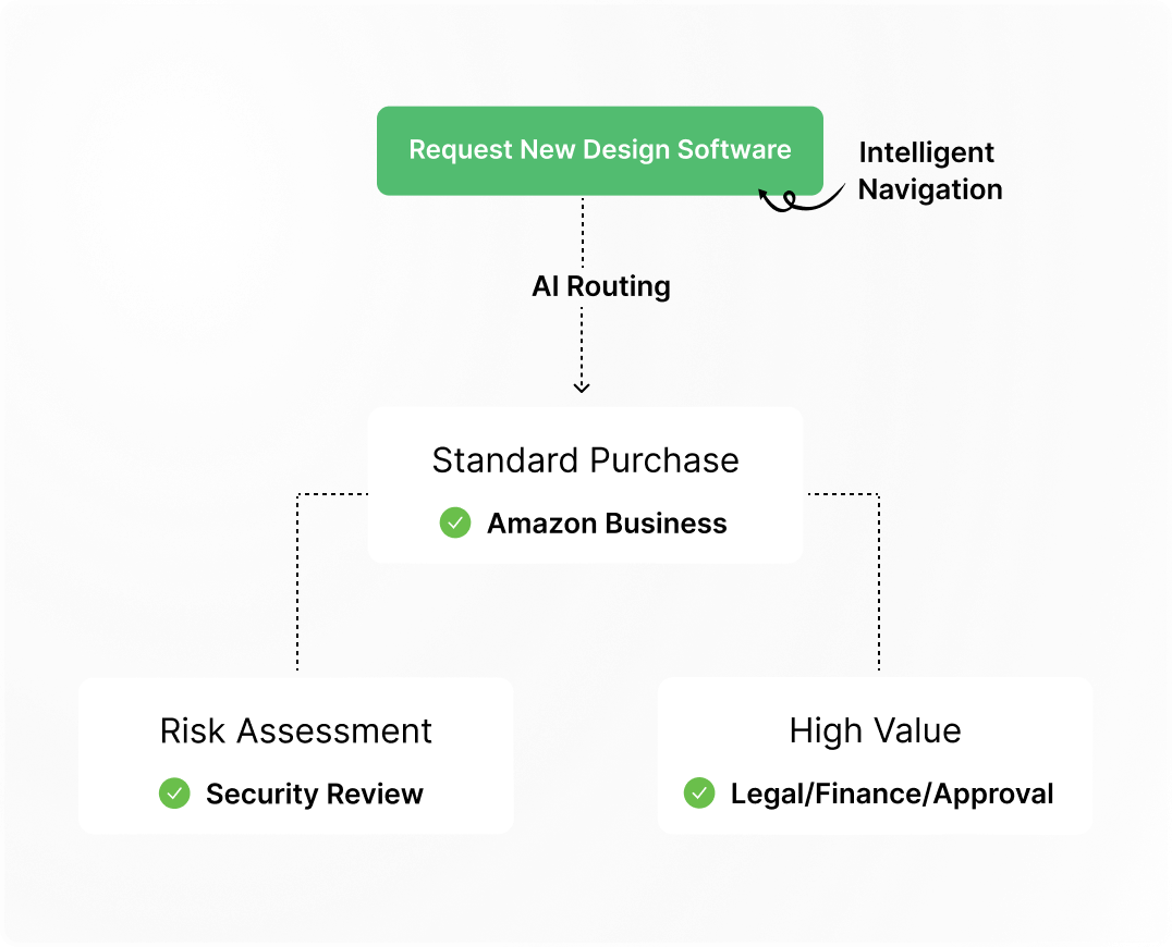 AI-powered intake ensures users are directed to the correct channels through intelligent navigation, including process steps, systems, risk assessments, and stakeholder groups, right from the start. This enhances accuracy and efficiency, improves user experience, optimizes team involvement, and accelerates the entire procurement process.